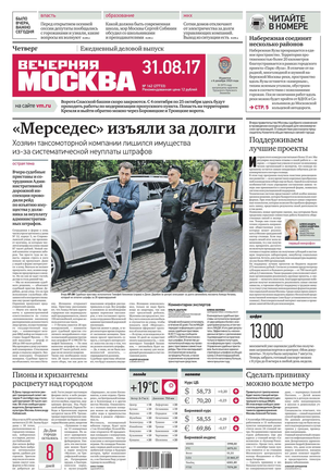 «Вечерняя Москва» — ежедневная российская вечерняя газета, старейшее из вечерних изданий в России, учрежденное в 1923 году. Выходит пять дней в неделю, кроме субботы и воскресенья. Отличается тем, что рассказывает о событиях еще не завершившегося дня. Оперативно освещает хронику и особенности жизни Москвы, охватывает все слои общества и большинство профессиональных и возрастных групп читателей.Издание представлено тремя выпусками – утренним ежедневным, вечерним (выходит три раза в неделю), еженедельным (выходит по четвергам).