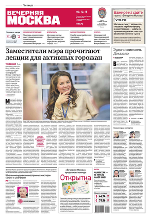 «Вечерняя Москва» — ежедневная российская вечерняя газета, старейшее из вечерних изданий в России, учрежденное в 1923 году. Выходит пять дней в неделю, кроме субботы и воскресенья. Отличается тем, что рассказывает о событиях еще не завершившегося дня. Оперативно освещает хронику и особенности жизни Москвы, охватывает все слои общества и большинство профессиональных и возрастных групп читателей.Издание представлено тремя выпусками – утренним ежедневным, вечерним (выходит три раза в неделю), еженедельным (выходит по четвергам).