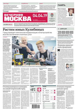 «Вечерняя Москва» — ежедневная российская вечерняя газета, старейшее из вечерних изданий в России, учрежденное в 1923 году. Выходит пять дней в неделю, кроме субботы и воскресенья. Отличается тем, что рассказывает о событиях еще не завершившегося дня. Оперативно освещает хронику и особенности жизни Москвы, охватывает все слои общества и большинство профессиональных и возрастных групп читателей.Издание представлено тремя выпусками – утренним ежедневным, вечерним (выходит три раза в неделю), еженедельным (выходит по четвергам).